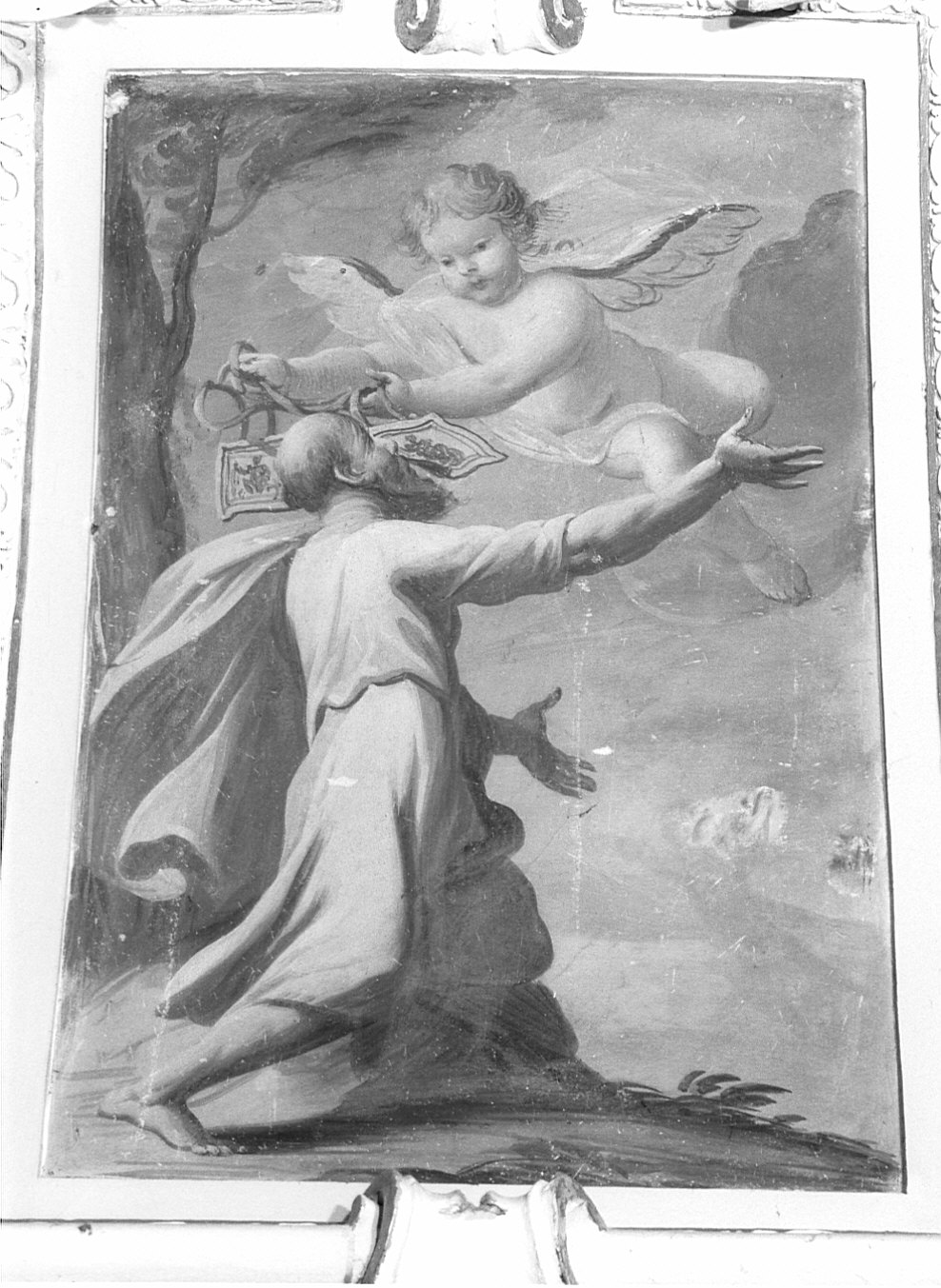Affresco circondato da cornice in stucco. Raffigura San SImone Stock che riceve lo scapolare da un angelo