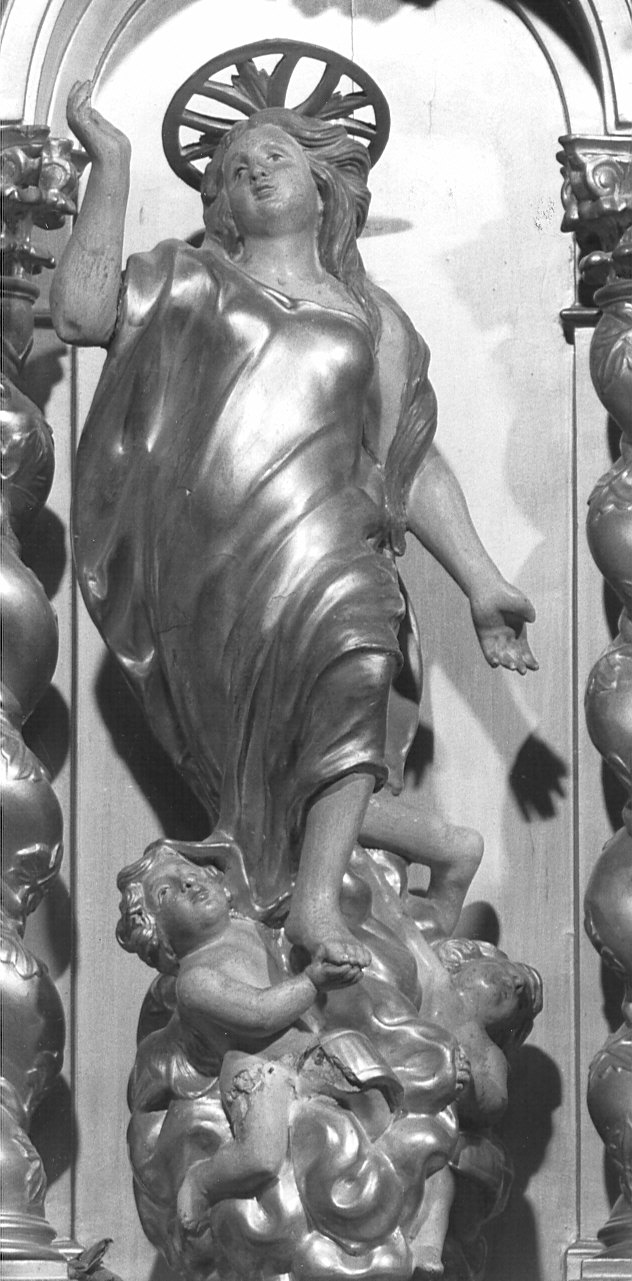Figura rivestita con tunica, sorretta da una coppia di angioletti entro nubi. I capeli sono molto lunghi e sopra il capo svi è un'aureola