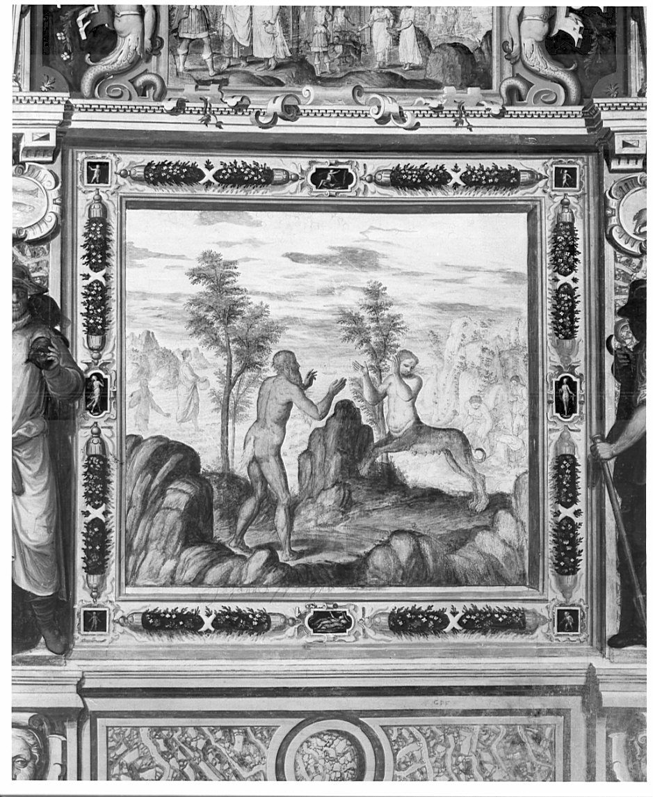 Entro cornice rettangolare con festoni e silhouttes monocrome si svolge la scena figurata fiancheggiata dalle allegorie dei mesi