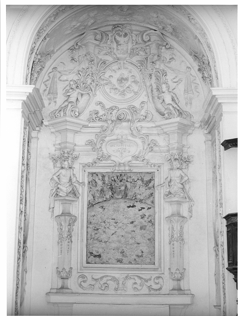 Lesene con ornati vegetali, angeli erma e capitello composito. Fregio liscio con targa a frontone interrotto. Sul timpano tondo con colomba e ai lati angioletti su volute e foglie di palma; stemma sulla sommità e drappi ai lati fermati da nastri