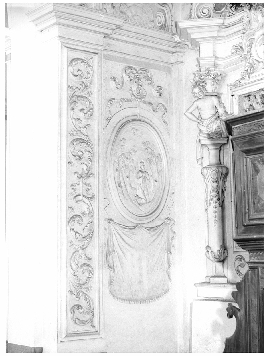 Ovale con scena figurata tra motivi decorativi vegetali, volute, nastri a drappo