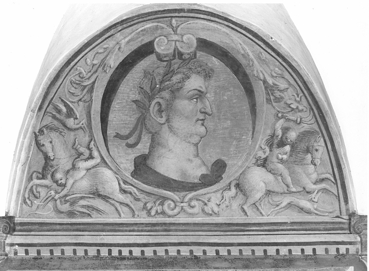 Figure maschili: mezzobusto di profilo; putti. Oggetti: corona d'alloro; frusta. Animali: cavalli; pellicani; cane. Decorazioni