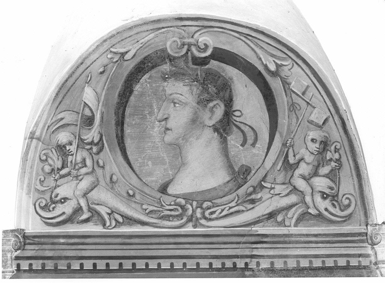 Figure maschili: mezzobusto di profilo; putti. Oggetti: corona d'alloro; bandiera. Animali: delfini. Decorazioni