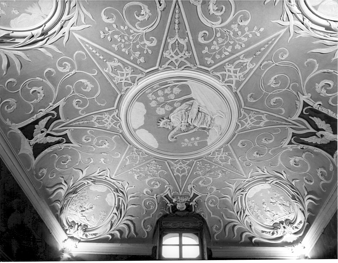 Decorazione articolata in cinque ovali con scene figurate da girali vegetali e nastri. Sui quattro ovali laterali sono raffigurati la Creazione di Adamo ed Eva, il Peccato Originale, la cacciata dal Paradiso Terrestre e illavoro dei progenitori. Nell'ovale al centro è raffigurato David che suona l'arpa/ cetra