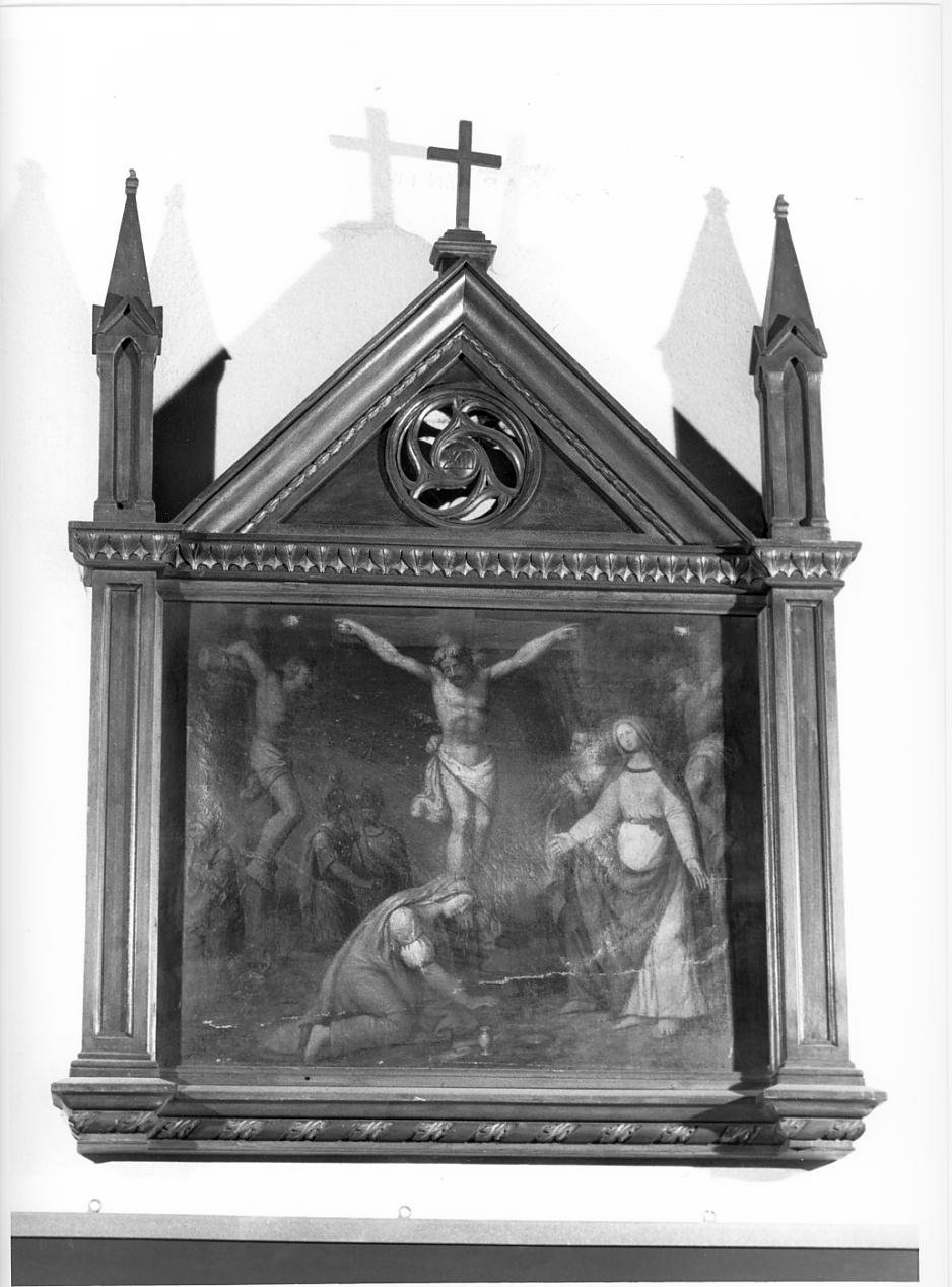 Personaggi: Cristo; Madonna; Santa Maria Maddalena; San Giovanni Evangelista. Figure: ladroni; soldati. Oggetti: croce; vaso