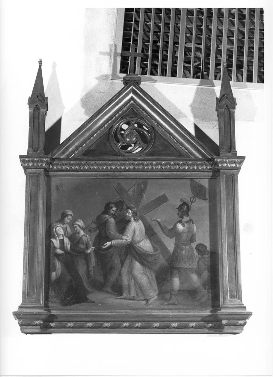 Personaggi: Cristo; Madonna. Figure: soldati; pie donne. Oggetti: croce;vessilli