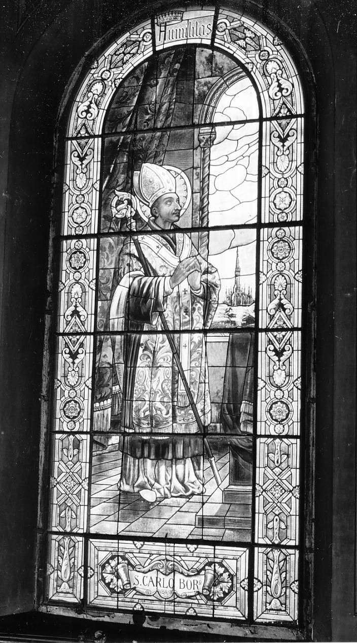 La vetrata di sinistra raffigura San Gregorio Magno in paramenti pontificali, con tiara ed aureola, mentre alza la mano destra benedicente. Sullo sfondo una colonna ed una finestra dai vetri piombati. Un puttino alato solleva un drappo verde dietro il santo. Nella vetrata di sinistra vi è San Carlo, con paramenti vescovili: mitria, dalmatica, pastorale e pianeta in broccato. Il santo con lo sguardo proteso ad un immaginario altare prega a mani giuinte. Sullo sfondo attraverso una finestra con un arco a tutto sesto ed una colonna tortile, s'intravedeono le guglie del Duomo di Milano