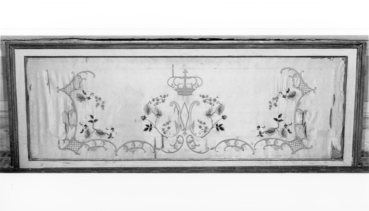 Ornato costituito da racemi stilizzati con andamento a volute, arricchiti da cartelle a griccia e da tralci di rose e fiordalisi, ripetuti al centro intorno al monogramma mariano, sormontato da corona con crocetta apicale