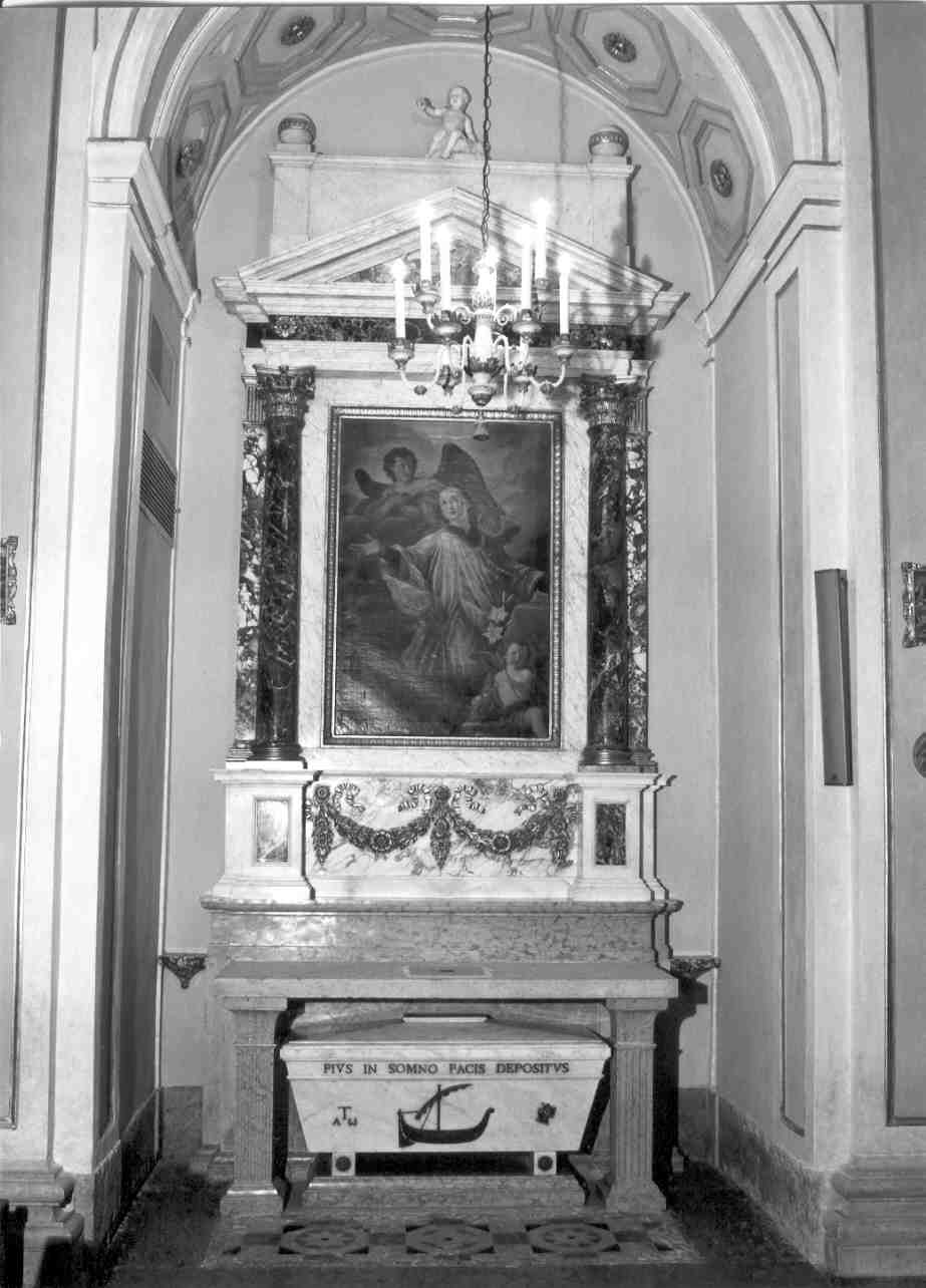 altare composto da mensa retta da colonne scanalate con capitelli a fogliame che inquadrano urna sepolcrale. Ancona con lesene e colonne su alti basamenti, tra i quali si dispongono festoni di fiori. Terminazione a timpano su cui poggia balaustra con angioletto al centro e sfere ai lati