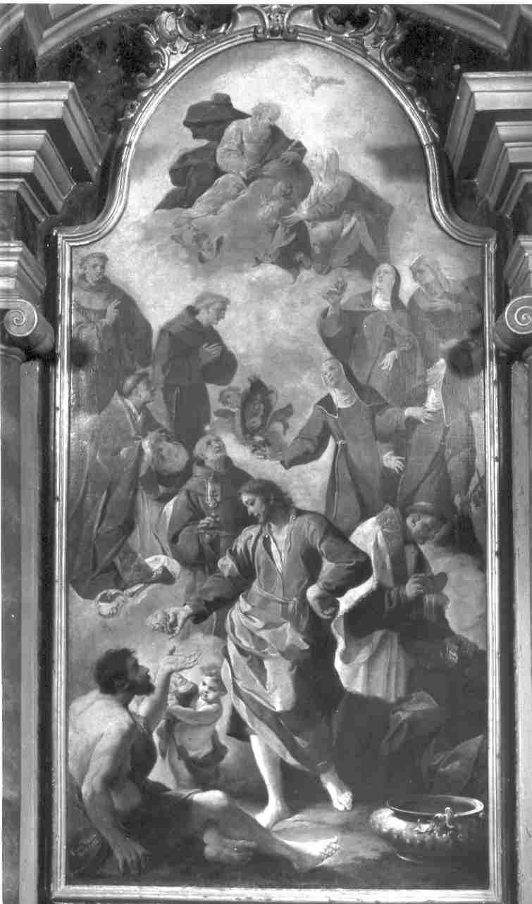 Personaggi: San Guglielmo; Sant'Anna; Maria Bambina; San Bernardino di Siena; San Ludovico di Tolosa; Sant'Elisabetta di Turingia; Santa Chiara; Dio Padre. Figure: santi francescani; sante francescane; mendicante; missionario; indigeno moro; angeli. Attributi: (San Bernardino) stella; ostensorio; saio; fisionomia; (San Guglielmo) pane; (San Ludovico di Tolosa) pastorale; piviale; (Sant'Elisabetta) saio; corona regale; (Santa Chiara) cuore fiammato. Oggetti: conchiglia battesimale; bacile; dipinto