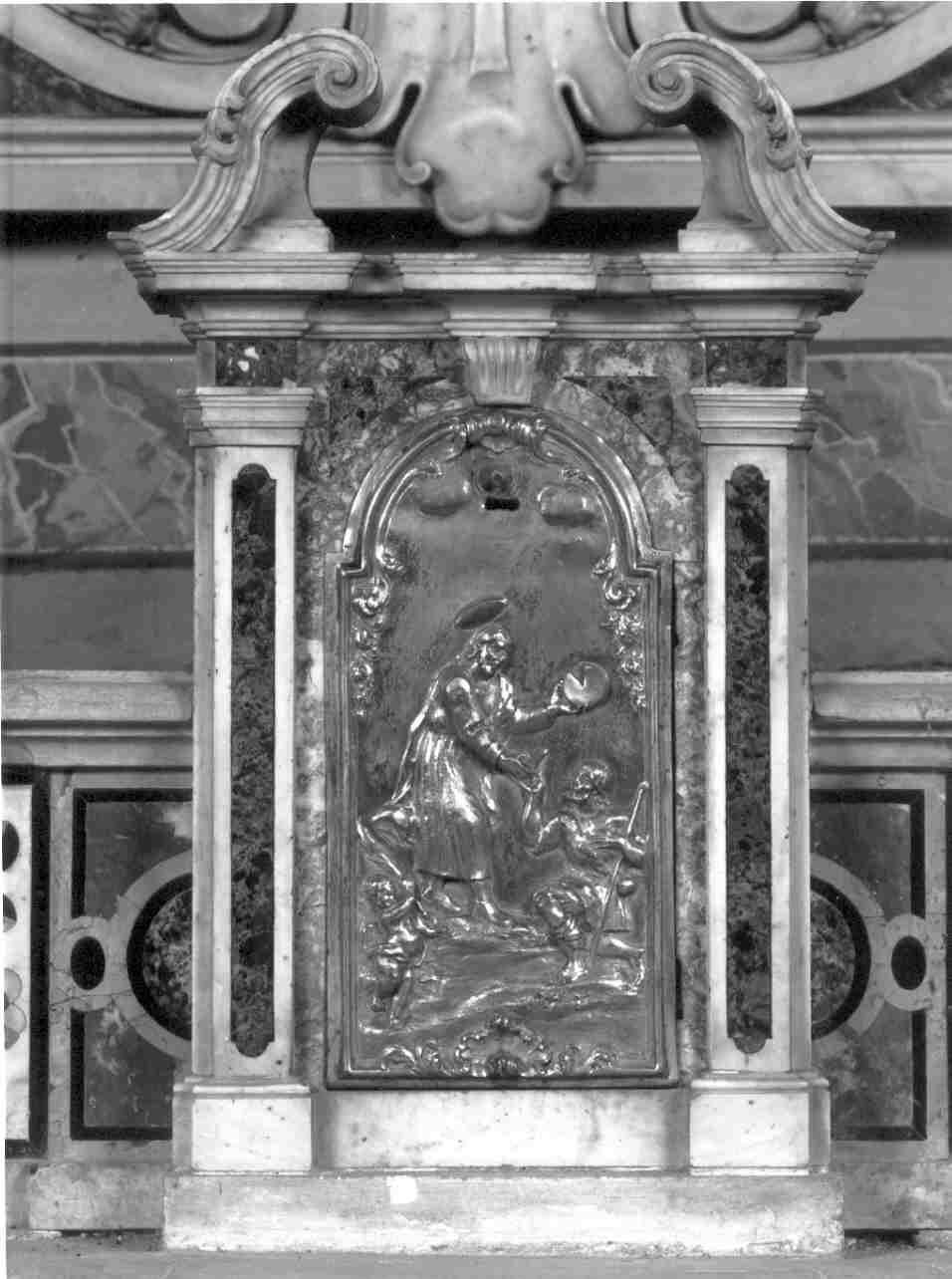tabernacolo con pilastrini, su podio, decorati da specchiature. Coronamento a volute su cornici in forte aggetto. Al centro sportello dorato dove è sbalzata la raffigurazione dell'elemosina di San Lucio