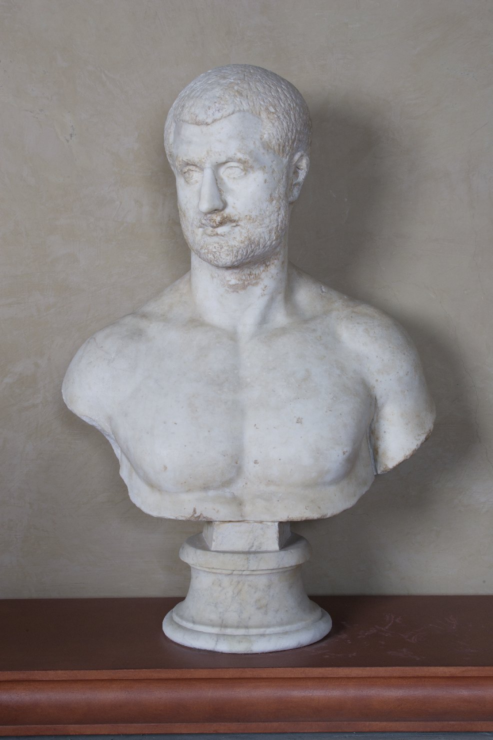 - NOTIZIE STORICO CRITICHE Testa ovale allungata con guance incavate (abrase), occhi con pupille a pelta, barba a solchi incisi che si estende su guance, mento e collo e sui baffi. Capelli corti, a piccolissime ciocche. Busto nudo con porzione delle spalle. Ritratto che si apparenta parzialmente a vari tipi di imperatori del III secolo d.C., in particolare a Filippo l'Arabo (244-249 d.C.). Ignota la provenienza. Forse al Museo dell'Accademia nel tardo Settecento e con questo trasferito al Palazzo degli Studi nel 1784 (circa). Poi a Palazzo Ducale a seguito della Convenzione del 1915 tra Comune di Mantova e Stato Italiano