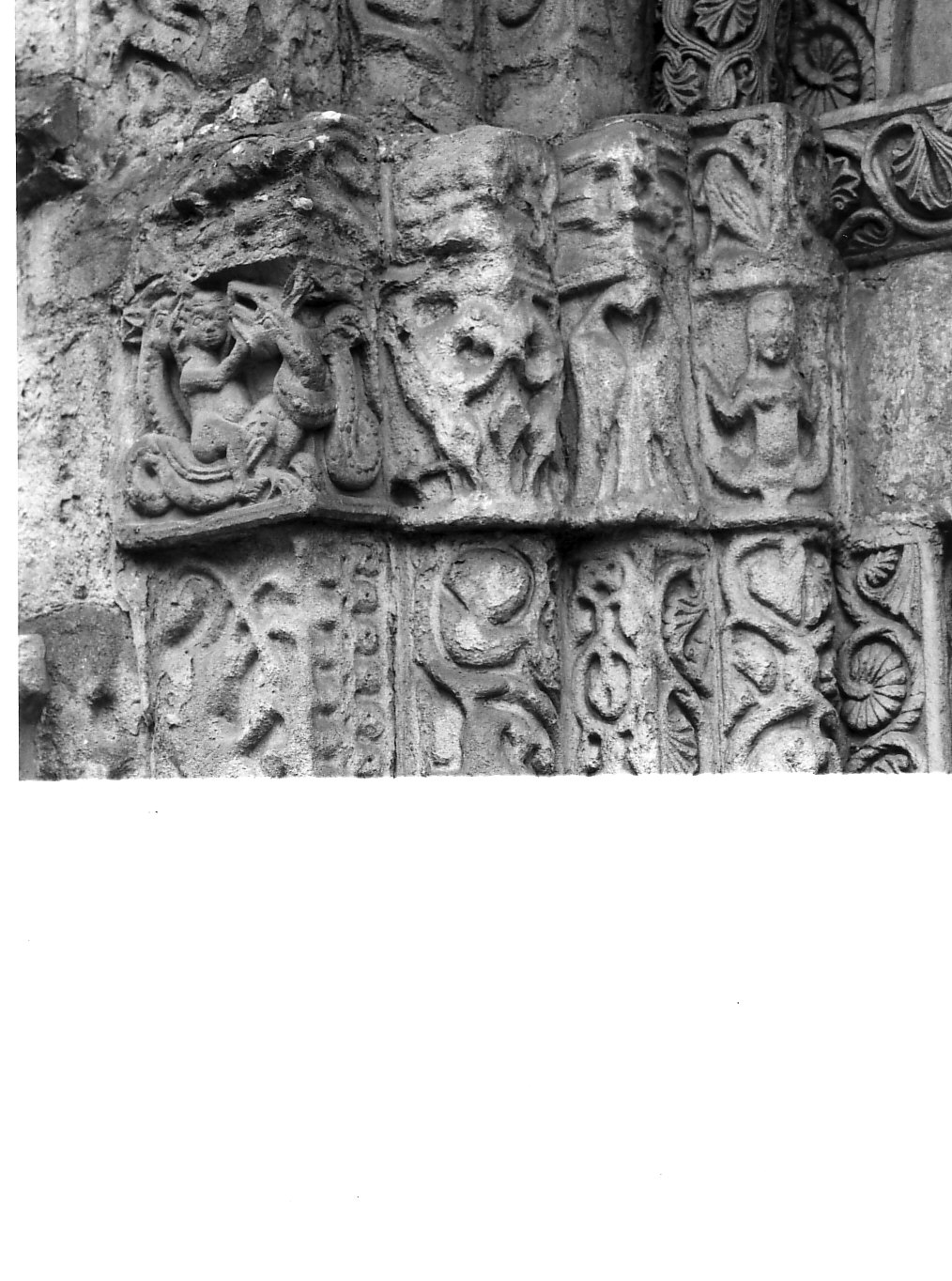 Capitello che rappresenta a rilievo una figura umana nuda che cavalca un drago a due teste, due ippogrifi, due uccelli e una sirena, altri animali e una serpe