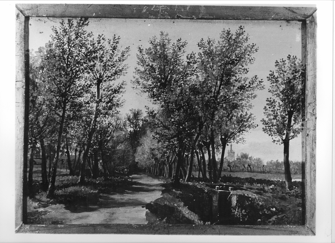 Dipinto raffigurante un viale tra pioppi. Sullo sfondo il Duomo di Milano. La tela è posta entro cornice dorata