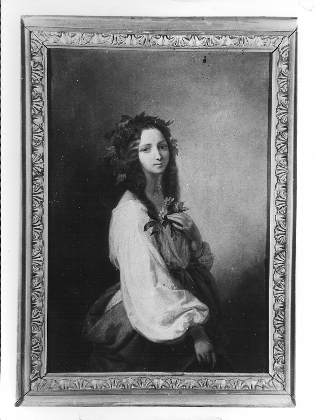 Dipinto raffigurante una donna su fondo monocromo con ghirlanda di edera sul capo e mazzetto di fiori nella mano sinistra