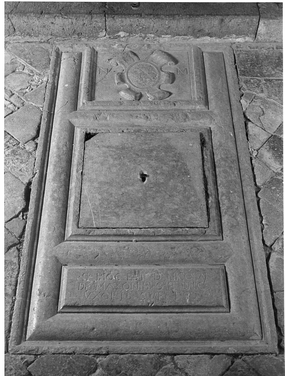 - NOTIZIE STORICO CRITICHE La lastra fa parte di un insieme di numerose lastre tombali appartenenti ad epoche diverse situate in collocazione presumibilmente originaria nel pavimento in cotto della chiesa. Capuani (1964) ne rileva l'esistenza collegandole a benefattori tra XVI e XVIII sec. Nell'inventario 1965 (Arch. Parr.) sono nominate. Gamba (1971/72 p. 127 e ss.) trascrive il testo di quasi tutte le iscrizioni (cfr per questa p. 131), ed è la prima a dimostrare per via documentaria il supposto legame tra tombe e personalità Almennesi di benefattori, producendo interessanti confronti archivistici. Vedi ms. 3095 Arch. Stato Milano per il periodo 1487-1568. Manzoni (1988 p. 280) trascrive le iscrizioni e riprende le tesi della Gamba, a pp. 188-189 e nn. 14, 20. Nicola Manzoni della parrocchia di S. Bartolomeo lasciò un'eredità in terreno e rendite al monastero ed alla confraternita del corpo di Cristo, fatto che generò varie liti. In particolare si ricorda la lite del 22 agosto 1615 fra i frati ed il curato di S. Bartolomeo per la sepoltura della moglie Domenica, la cui salma fu trasportata varie volte da una chiesa all'altra (Gamba 1971/72 p. 223s e ms. Filza s. contenziose 15 Arch. Curia Vesc. Bg.) fino al definitivo seppellimento in questa chiesa. Cfr anche Manzoni p. 195 e n. 47. La questione si potè risolvere anche grazie al fatto che proprio nella cappella di fronte al sepolcro vi era un antico dipinto raffigurante la Madonna, S. Lorenzo, un Santo Vescovo e come donatori Nicola Manzoni e la moglie Domenica, attribuito al Caravaggio. Cfr ms. Filza s. contenziose 15 Arch. Curia Vesc. Bg