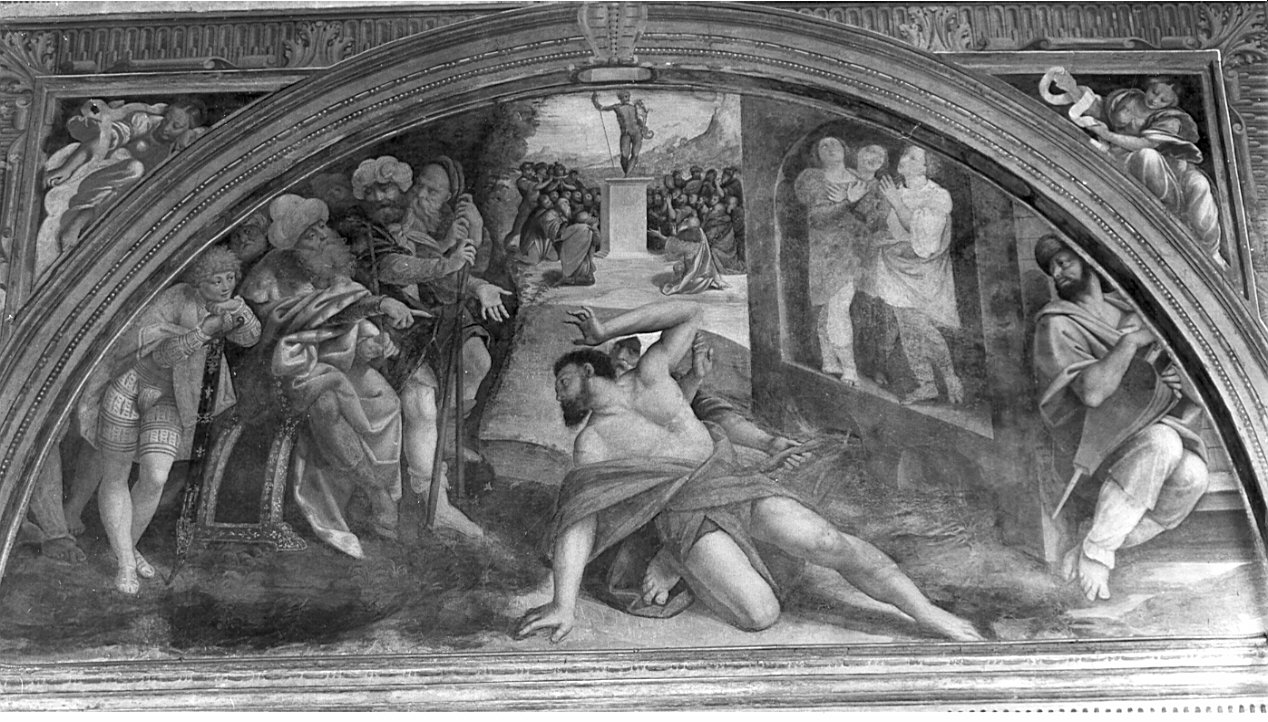 Personaggi: Daniele. Figure: cortigiani; carnefici; tre giovani ebrei; fedeli. Architetture: fornace. Oggetti: mantice; bastoni; scettro. Mobilia: seggio. Armi: spada. Sculture: idolo. Paesaggi