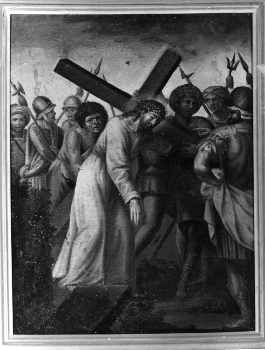 Personaggi: Cristo; Simone il Cireneo. Figure maschili: soldati. Oggetti: croce; corona di spine. Armi: lance