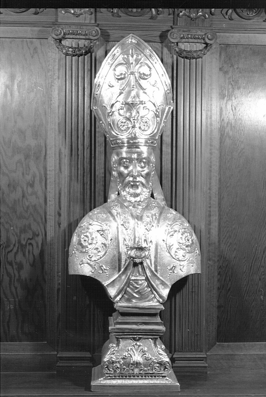 Vescovo con barba corta. Fa parte d una serie di 4 reliquiari a busto in lamina di metallo con supporto in legno