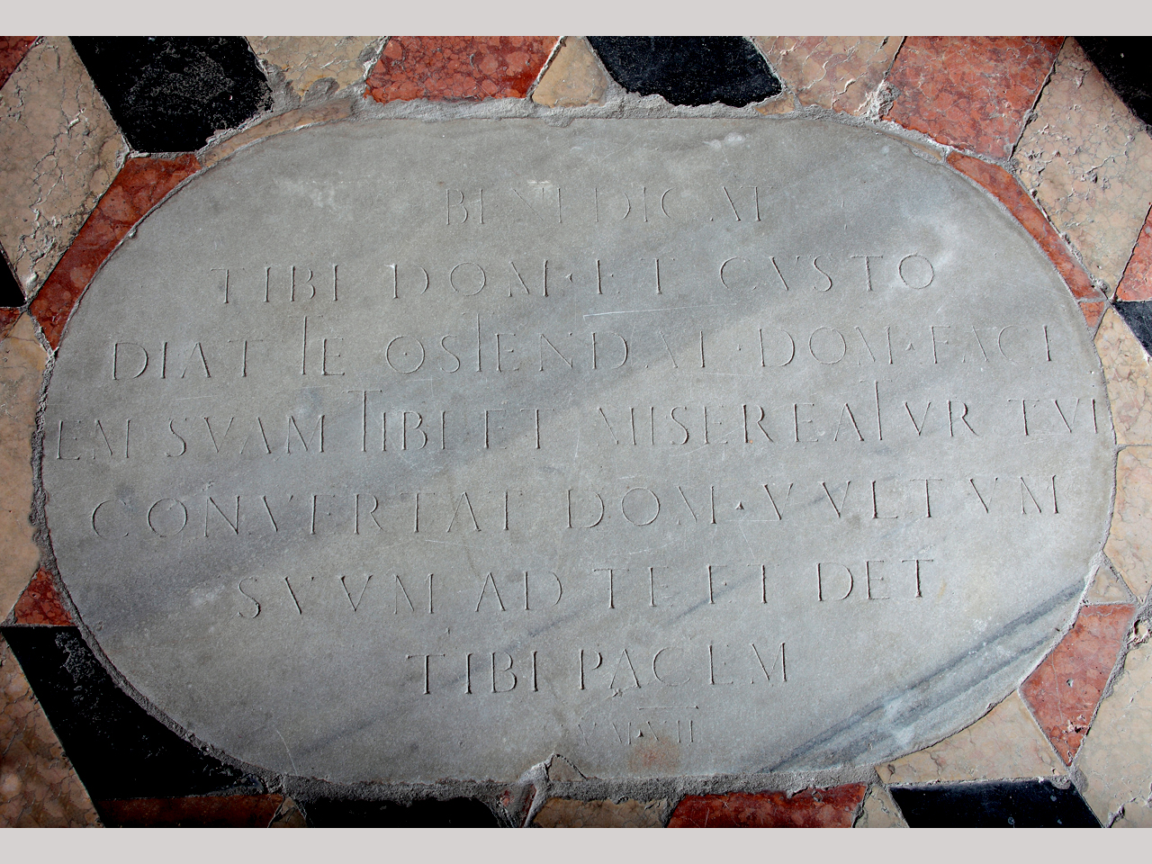 - ISCRIZIONI al centro - BENEDICAT/ TIBI DOM ET CUSTO/ DIAT TE OSTENDAT DOM FACI/ EM SUAM TIBI ET MISEREATUR TUI/ CONVERTAT DOM VULTUM/ SUUM AD TE ET DET/ TIBI PACEM/ V M VII - capitale -