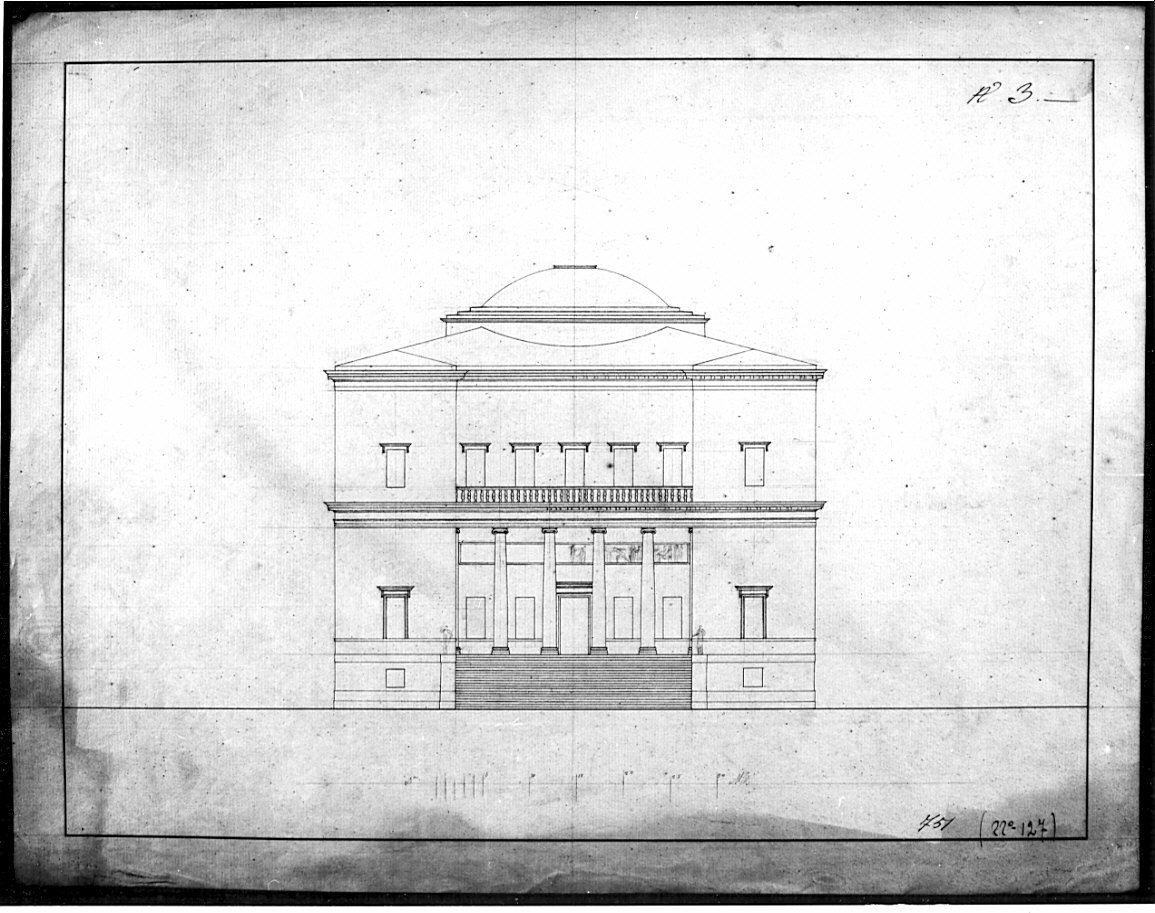 Alzato di edificio a china e matita su fondo chiaro entro linea di margine a china e bordo chiaro.Prospetto di edificio a due piani con portico centrale preceduto da gradinata e fornito di colonne con capitello ionico. Sulla facciata. interna del portico tracce a matita della decorazione di fregio continuo. Superiormente: balaustra centrale, serie di aperture modanate con mensola superiore, copertura, a falde con cupola centrale ribassata preceduta da gradoni