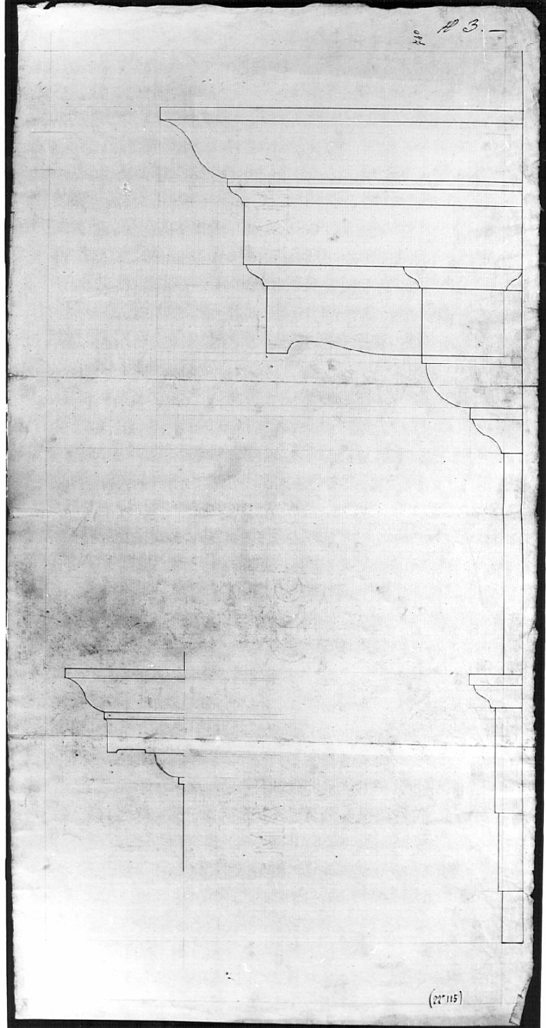 Alzato e profilo di trabeazione con vista dell'architrave tripartita, del fregio e delle cornici superiori a china su fondo chiaro. Inf. sin.: profilo delle cornici