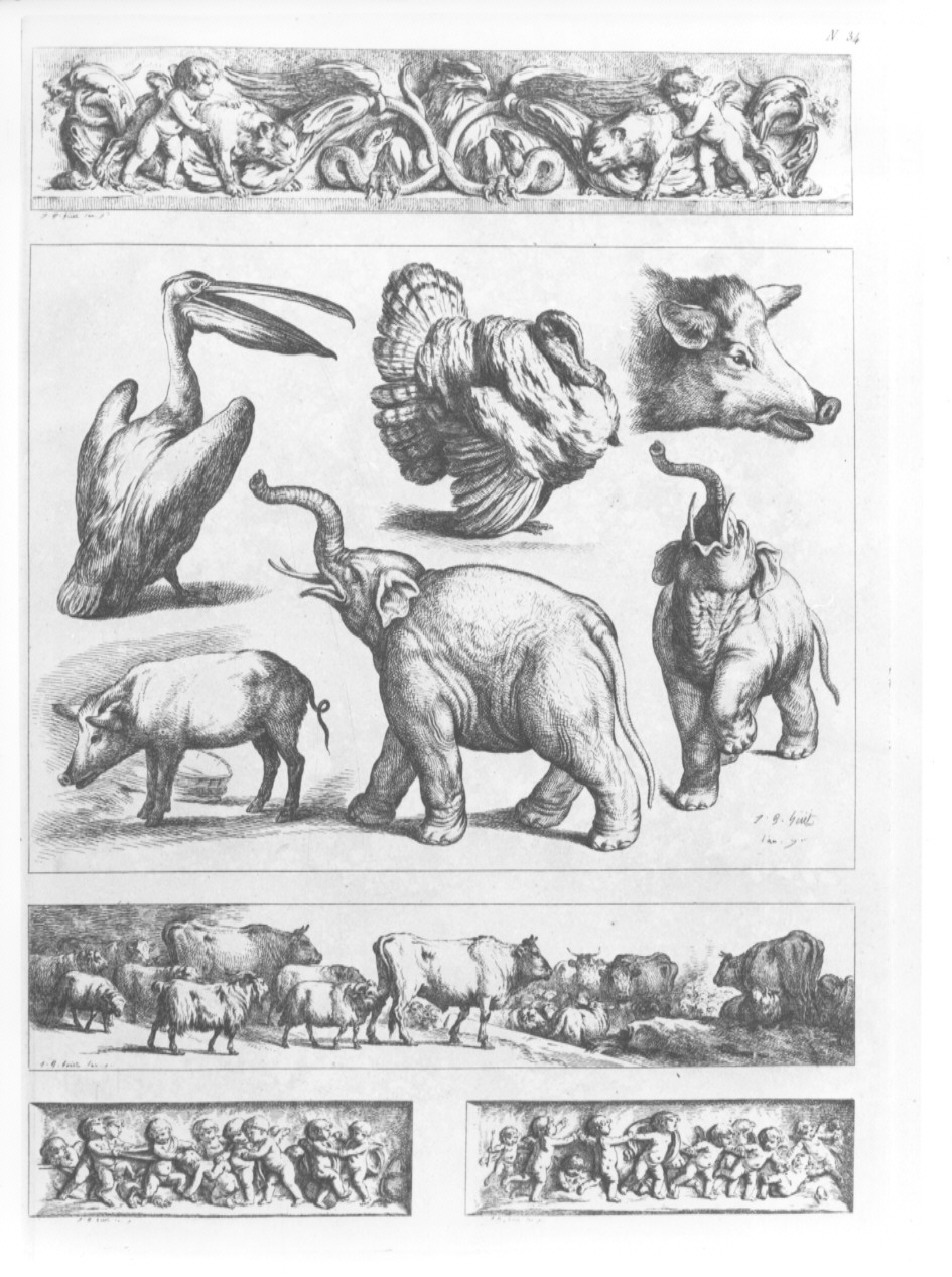 - NOTIZIE STORICO CRITICHE L'acquaforte si compone di cinque riquadri che raffigurano vari animali e tre fregi: il primo con animali fantastici e due putti, i due inferiori con putti che giocano