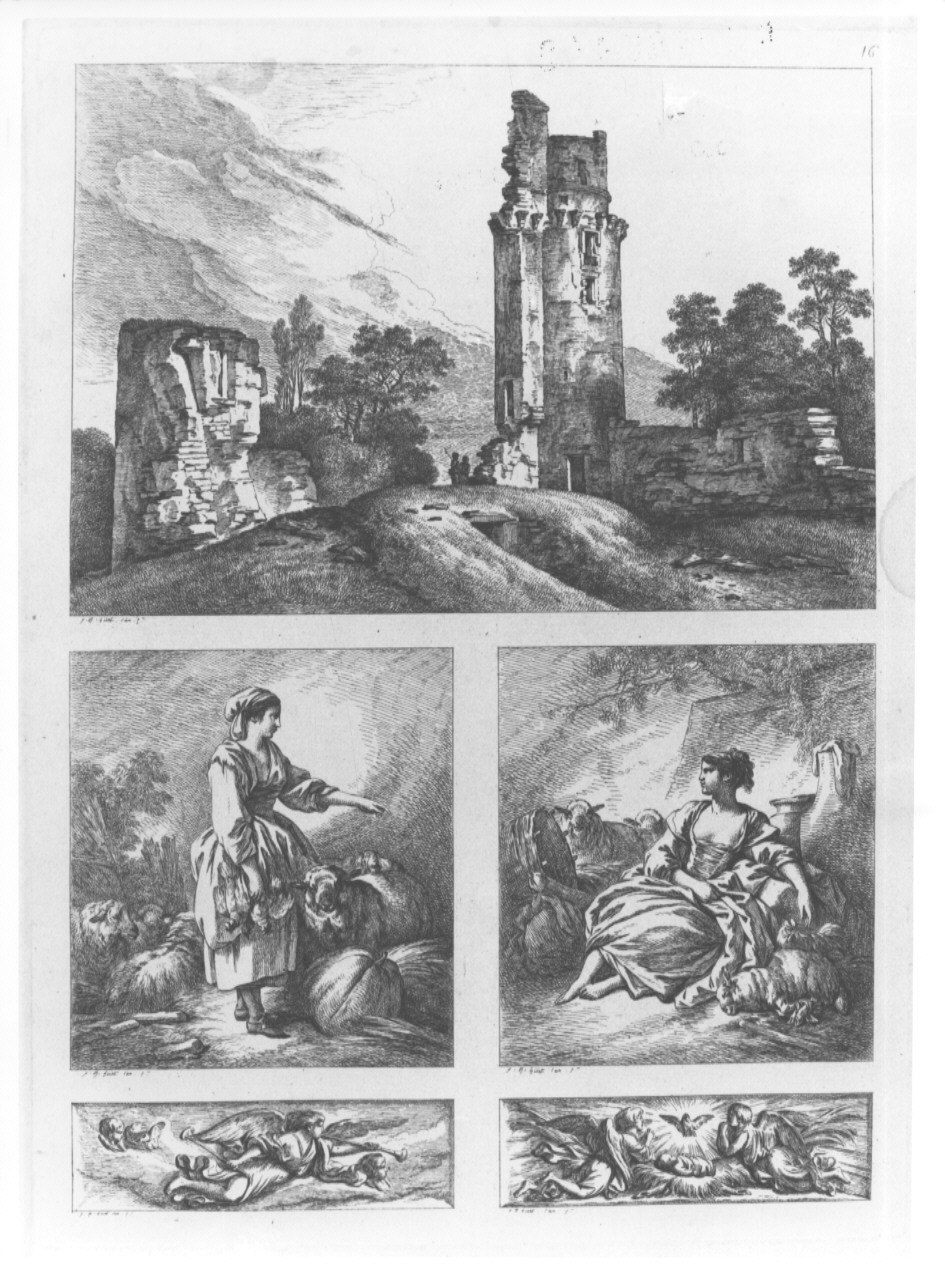 - NOTIZIE STORICO CRITICHE L'acquaforte si compone di cinque riquadri: il primo mostra un paesaggio con rovine, molto accurato nell'esecuzione chiaroscurale; quelli centrali raffigurano due contadine con i loro animali, mentre quelli finali vedono la rappresentazione di un angelo che suona la tromba e dell'Adorazione di Gesù Bambino da parte di due angeli