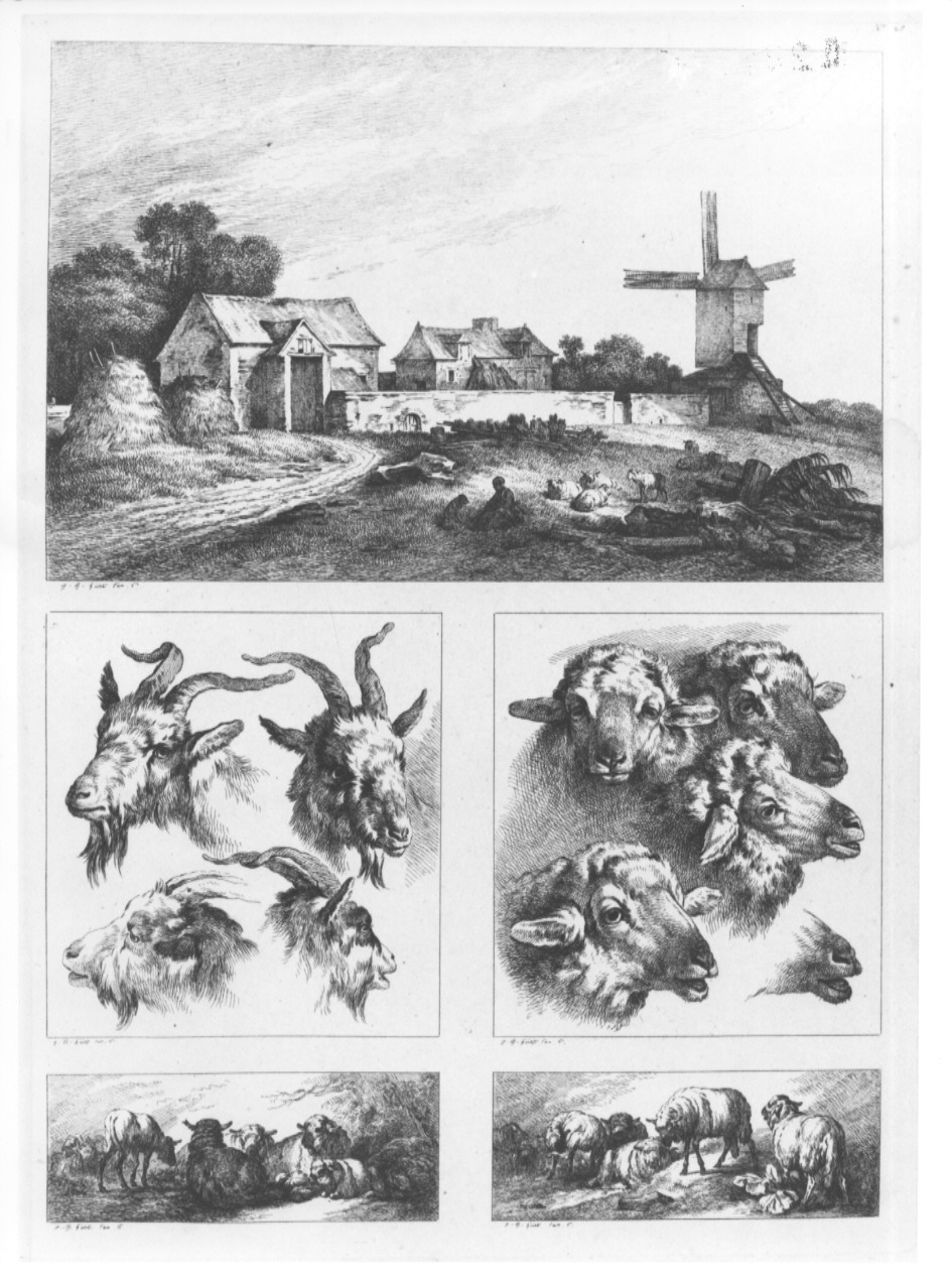 - NOTIZIE STORICO CRITICHE L'acquaforte si compone di cinque riquadri: il primo mostra un paesaggio con una fattoria ed un mulino a vento, gli altri raffigurano teste di pecore, capre e gli stessi mentre pascolano