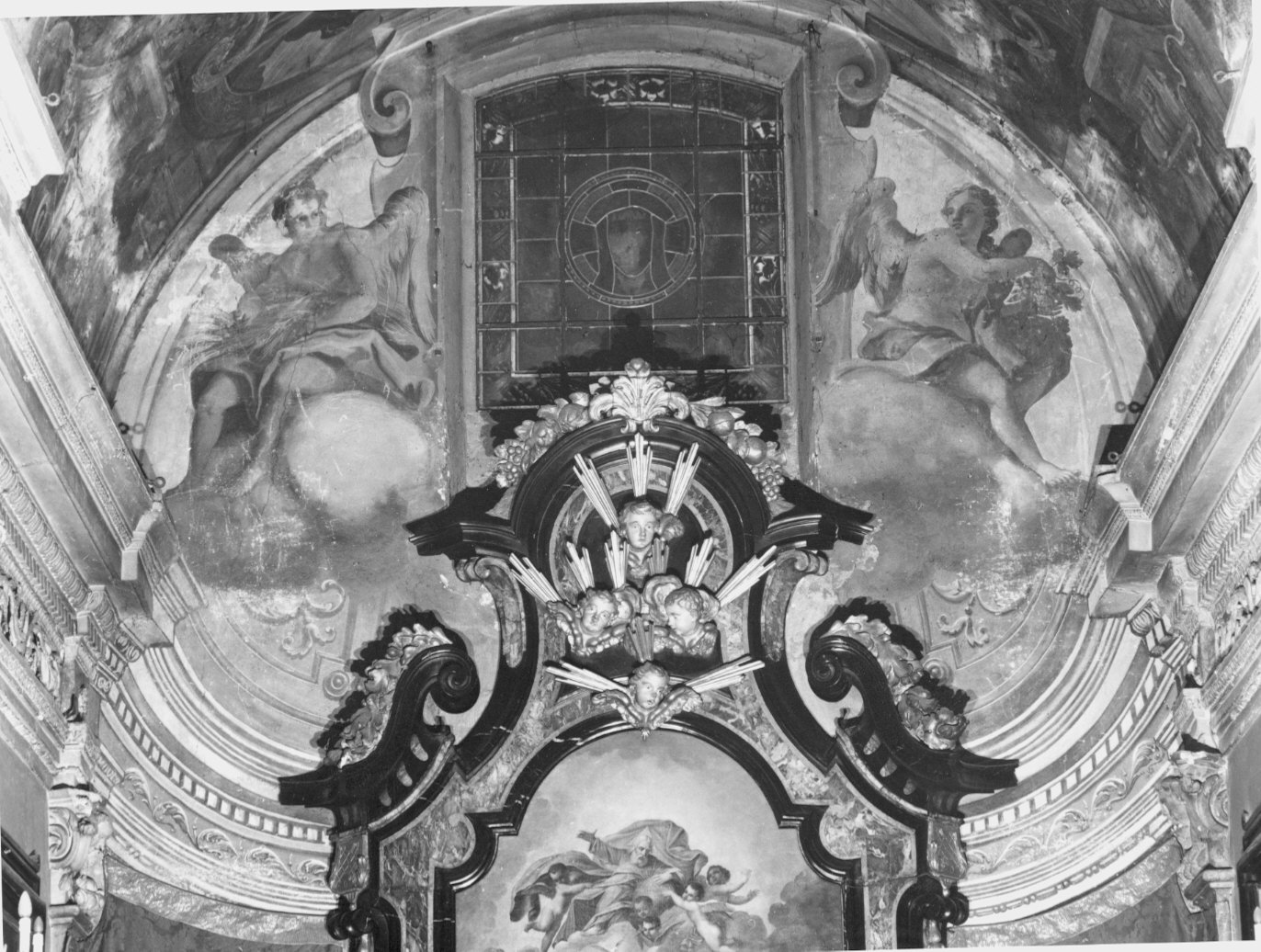 La parete di fondo del presbiterio presenta una lunetta decorata con una leggera quadratura grigia. Sono raffigurati due grandi angeli assisi sulle nubi. Quello di destra tiene in mano grappoli d'uva e pampini; quelli di sinistra ha in mano spighe di grano
