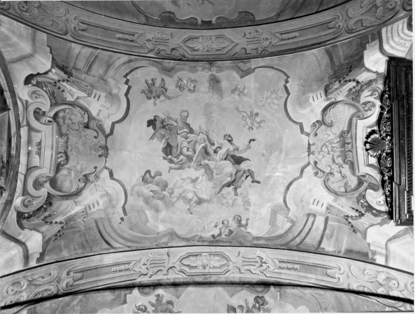 - NOTIZIE STORICO CRITICHE L'esecuzione dell'intero ciclo di affreschi è documentata nel Libro della Confraternita del SS. Confraternita del SS. Sacramento, da cui si ricava la notizia che negli anni 1712-13 la Confraternita fece affrescare la chiesa al "sig. Pietro Bianchi pittore di Como", con una spesa complessiva di 200 filippi. Il pittore aveva già operato a Morbegno nel Santuario dell'Assunta (1703-1706), nella chiesa di Sant'Antonio (1707) e avrebbe lavorato anche negli anni successivi, nella collegiata di San Giovanni (1716). In San Pietro l'artista svolge un ciclo di grande impegno e di grande interesse iconografico, lavorando su un vasto programma dettatogli probabilmente dalla Confraternita committente e legato alla storia della chiesa di San Pietro. Infatti, è evidente nel ciclo un messaggio fortemente carcato verso l'esaltazione della religione cattolica e delle sue istituzioni contro gli attacchi del protestantesimo e questo è da mettere in relazione con la circostanza che vide la chiesa di San Pietro assegnata per un certo periodo ai protestanti per la celebrazione dei loro culti (dal 1560 al 1620), negli anni delle contese religiose in Valtellina.Le pareti interne della chiesa presentano un vasto ciclo di affreschi, che ricopre interamente la controfacciata, le volte della navata, delle cappelle e del presbiterio, le lunette e l'abside. L'intero ciclo è legato da quadrature che sottolineano l'architettura delle volte e che continuano con motivi decorativi nei sottarchi tra le campate e in quelle delle cappelle e del presbiterio.Problematica la spiegazione dei due monocromi laterali, in cui la stessa identificazione del soggetto (nel caso della lunetta di sinistra in particolare) non è del tutto sicura, e poco chiari rimangono alcuni particolari