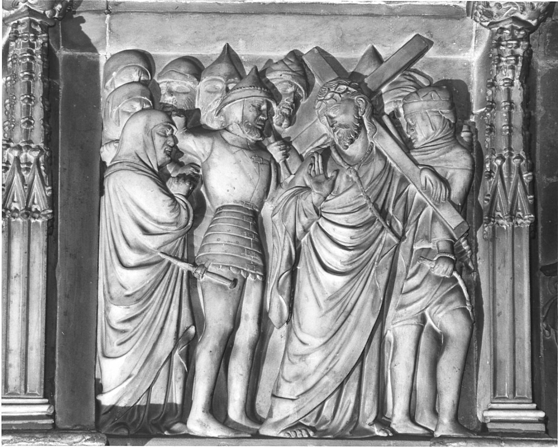 Formella di marmo bianco di Carrara tirato a lustro, scolpita ad altorilievo, raffigurante Gesù, in ampia tunica, incoronato di spine, con la croce sulle spalle, mentre sale al Calvario tra due sgherri; quello che lo precede tiene la corda legata al collo di Gesù che si volge verso la Vergine a sinistra, in piedi, gli occhi chiusi, le mani serrate. In secondo piano sei personaggi di cui due sono visibili solo le teste assistono alla scena