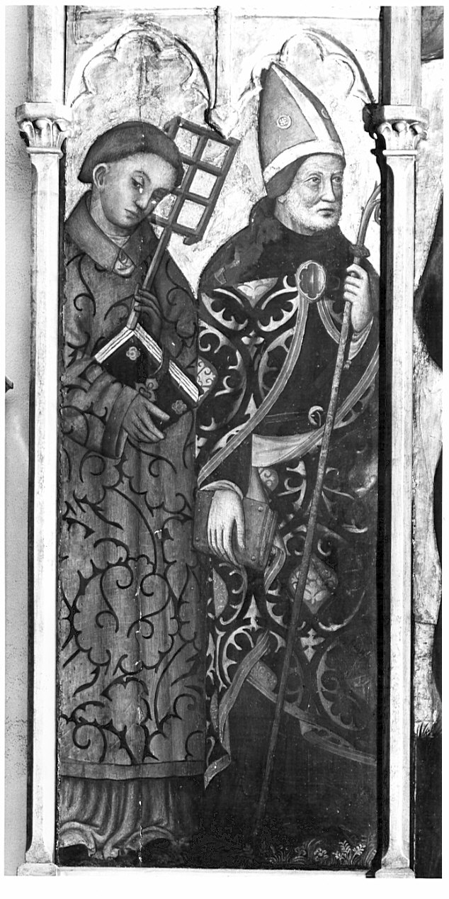Personaggi: San Lorenzo; Sant'Agostino. Oggetti: graticola; libro; pastorale