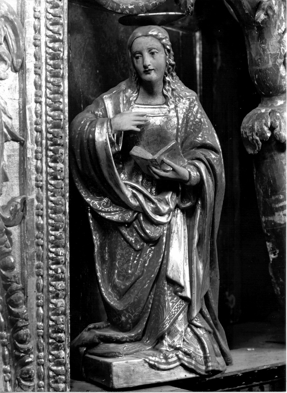 - NOTIZIE STORICO CRITICHE L'esecuzione dell'opera è documentata in modo preciso da una serie di note di pagamento conservate nell'archivio della chiesa, da cui risulta che lo scultore Giovanni Angelo Del Maino stipulò, il 18 agosto 1516 un contratto con la Compagnia dei Battuti e ricevette poi pagamenti per il suo lavoro fino al 1519. Dal 1520 al 1526 risultano invece effettuate altre spese a favore di Gaudenzio Ferrari e di Fermo Stella per la doratura e la dipintura dell'opera. La statua fa parte del gruppo di figurazioni della fascia mediana dedicata all'Annunciazione; rubata nel 1977 venne recuperata