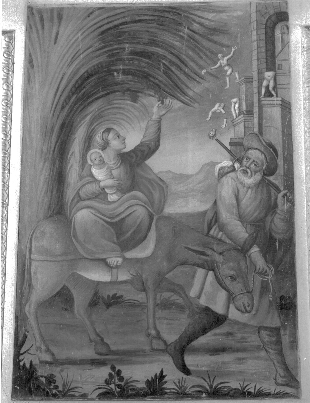 - NOTIZIE STORICO CRITICHE Fuga in Egitto.Sullo sfondo a dx si vede la prefigurazione della strage degli innocenti. Gustosa e realistica è la narrazione del Miracolo della palma che si china al passaggio della Sacra Famiglia con la vergine che allunga la mano per raccogliere i datteri