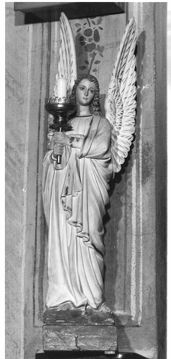 Coppia di angeli portacandelabro su base rettangolare. Candeliere sagomato con piattello rettangolare e ghiera decorata con motivo a giorno