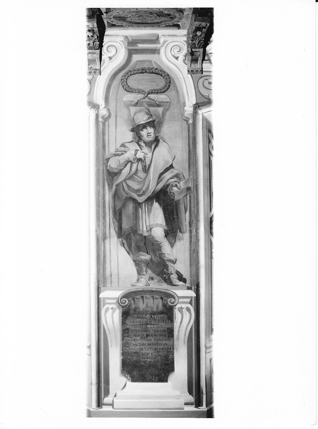 - ISCRIZIONI sul cartiglio alla base della figura - IOANNES PUSTERLA / NOBILISSIMUS EQUES / ALEXANDRIAE ET VERCELLAR / IUSTISSIMUS PRAETOR / PUBLICA LEGATIONE / PRUDENTISSIME FUNCTUS / EXACTAM NEPOTIBUS / MAGNAR VIRTUTUM IMAGINEM / LIQUIT/ MCCCX - lettere capitali - a pennello - latino
