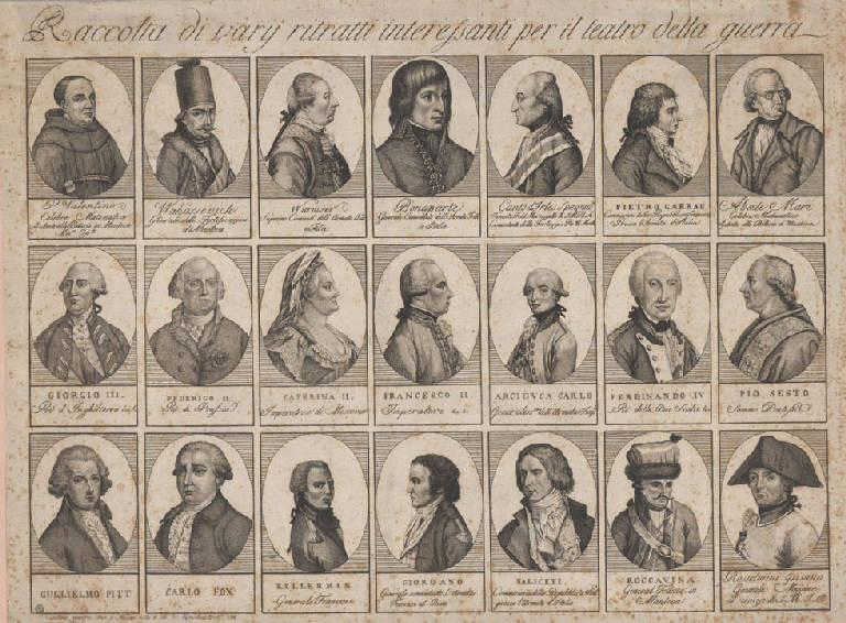 Ritratti: Napoleone Bonaparte generale; P. Valentino; Wahassevich; Wurmser; Pietro Carrau; abate Mari; Giorgio III re d'Inghilterra; Federico II re di Prussia; Caterina II imperatrice di Russia; Francesco II imperatore; arciduca Carlo; Ferdinando IV re delle due Sicilie; Pio VI papa; Guglielmo Pitt; Carlo Fox; Kellerman; Giordano; Saliceti; Roccavina; Rosselmini