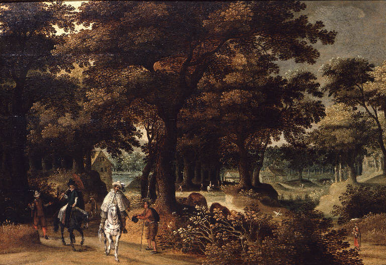 Il conte Luca de' Vecchi a cavallo. Paesaggio con alberi e cavalieri