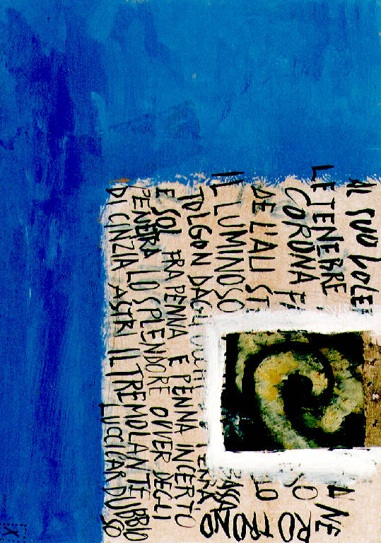 Opera polimaterica caratterizzata da un collage in stoffa su parole au fondo azzurro
