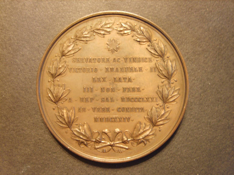 Ritratti: Vittorio Emanuele II. Abbigliamento: uniforme. Divinità: Minerva. Mobilio: trono. Figure: figura femminile alata. Oggetti: corona