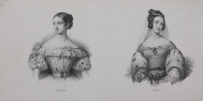 - ISCRIZIONI in basso, presso le rispettive figure - DALHIA. LAURE - corsivo - francese