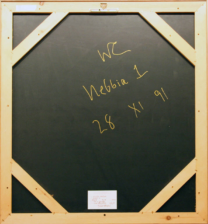 - ISCRIZIONI etichetta adesiva retro cornice in alto a sinistra - 832.00/ NEBBIA 1 1991/ cm 90 x 80/ olio su pannello/ Collezione dell'artista - Congdon Grosvenor, William - corsivo - a penna/ a stampa -