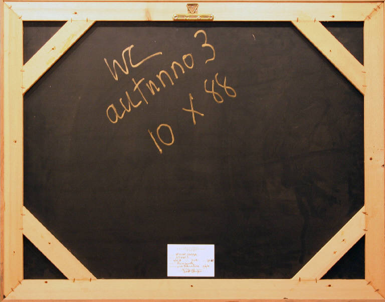 - ISCRIZIONI etichetta adesiva retro pannello basso al centro - THE FOUNDATION/ FOR IMPROVING UNDERSTANDING/ OF THE ARTS/ AUTORE WILLIAM CONGDON/ TITOLO AUTUNNO, 3/ DATA 10/10/88/ MISURE cm 70 x 90 CODICE 743.42/ TECNICA olio su pannello/ DONAZIONE x via testamentaria 15/01/99/ FONDAZIONE COMPRENSIONE ARTI/ VIALE LOMBARDIA 10 20090 BUCCINASCO (MILANO) ITALIA Paolo Mangini - Congdon Grosvenor, William - corsivo - a penna/ a stampa -