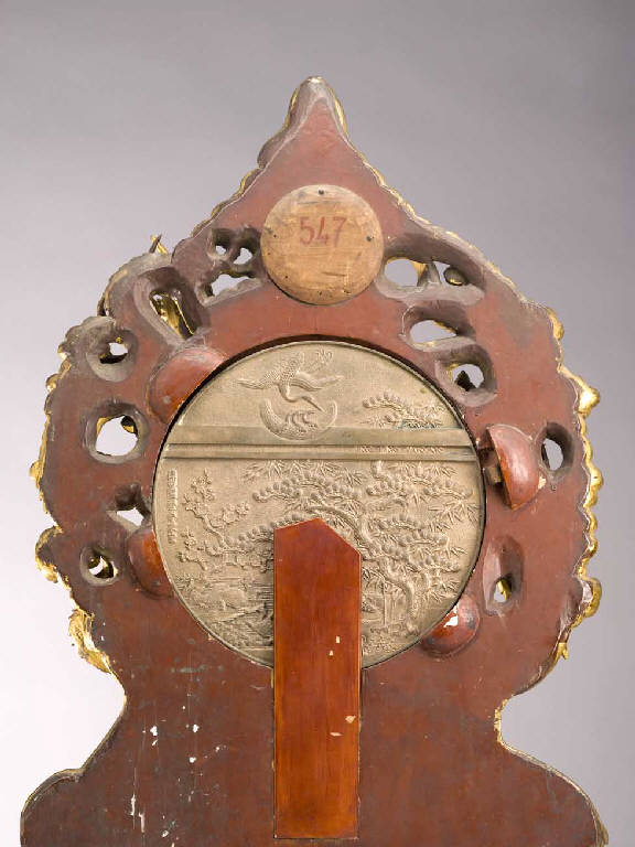Specchio rotondo con manico (e-kagami) raffigurante gru (tsuru), tartaruga (kame), pino (matsu), susino (ume) e bambù (take) sulla riva del mare. "E' montato su una specchiera da tempio in legno costituita da tre elementi: la parte superiore a forma di aureola dorata, decorata con due draghi, e la parte inferiore a onde dorate con base in legno laccato rosso, blu e oro. E' utilizzata per il rito shintoista." (P. Amadini, documentazione in Museo)