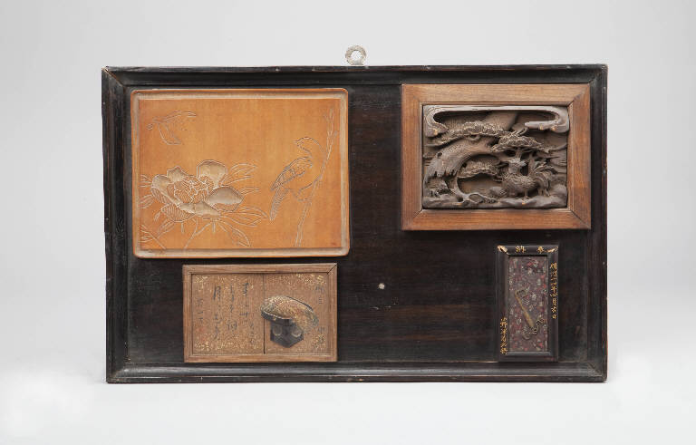 Tavoletta in legno incisa con effetto bassorilievo. La scena raffigura un uccello posato su un ramo, una farfalla e una camelia