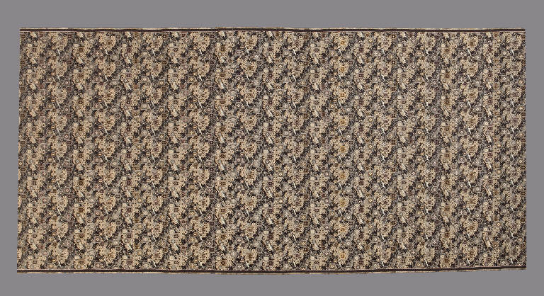 Tessuto operato con trame supplementari in seta. Tessuto marrone con motivo in oro di griglia a guscio di tartaruga alternata a motivo di onde stilizzate (segaha). Sono disposti sopra in modo sparso (chirashi moyo) disegni di gru (tsuru) in volo, foglie di acero (momiji), fiore di pruno (ume) e fiori cinesi (karahana) in esagoni