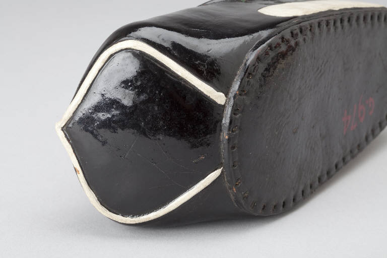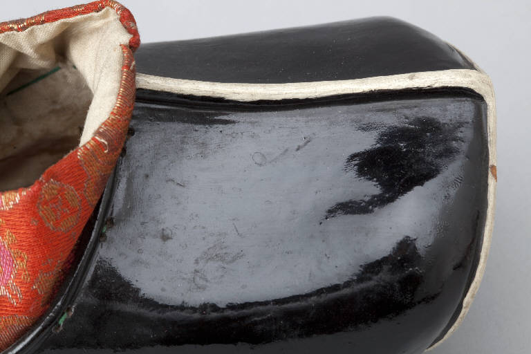 Paio di scarpe femminili (o da bambino?) in legno laccato di nero con mascherina in tessuto a fiorami rosso