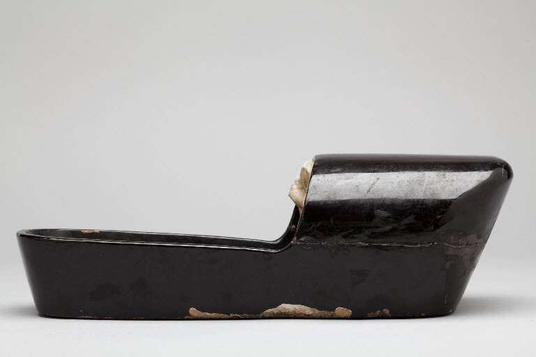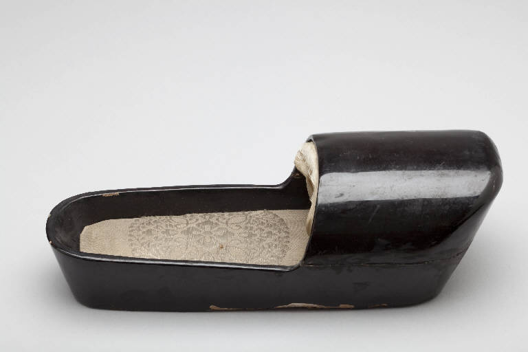 Paio di scarpe da uomo in legno laccato di nero; interno in seta bianca con decorazioni floreali