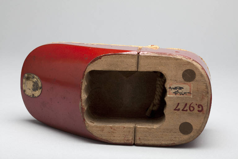 Paio di zoccoli (geta) in legno laccato di rosso con piano d'appoggio del piede in finissima paglia. Cordone infradito in seta rossa con disegno in oro opaco di crisantemi (kiku) e "fiori cinesi" (karahana). Tacco unico, cavo